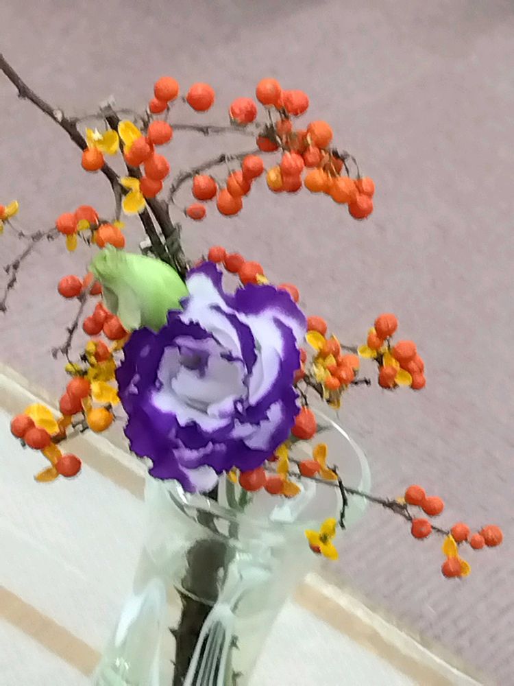 ツルウメモドキに季節が。トルコキキョウは余りにもしっかりとした色合いに最初造花かと見間違ったです🤩😛