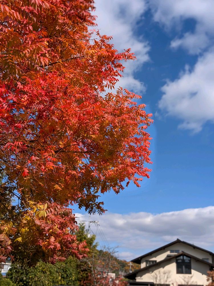 ①②病院のお庭の木が燃えるように赤く紅葉🍁してて、空の青と映えて綺麗だったよ〜✨(*^^*)