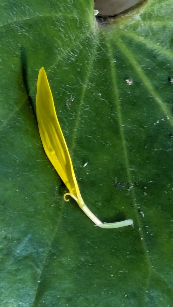 キク科おなじみ、筒状花は両性で5つに裂けて、雌しべはクルリ➰ 周辺から開いていく🟡 葉に乗せたのは舌状花で、雌性なので雄しべはないね💛
