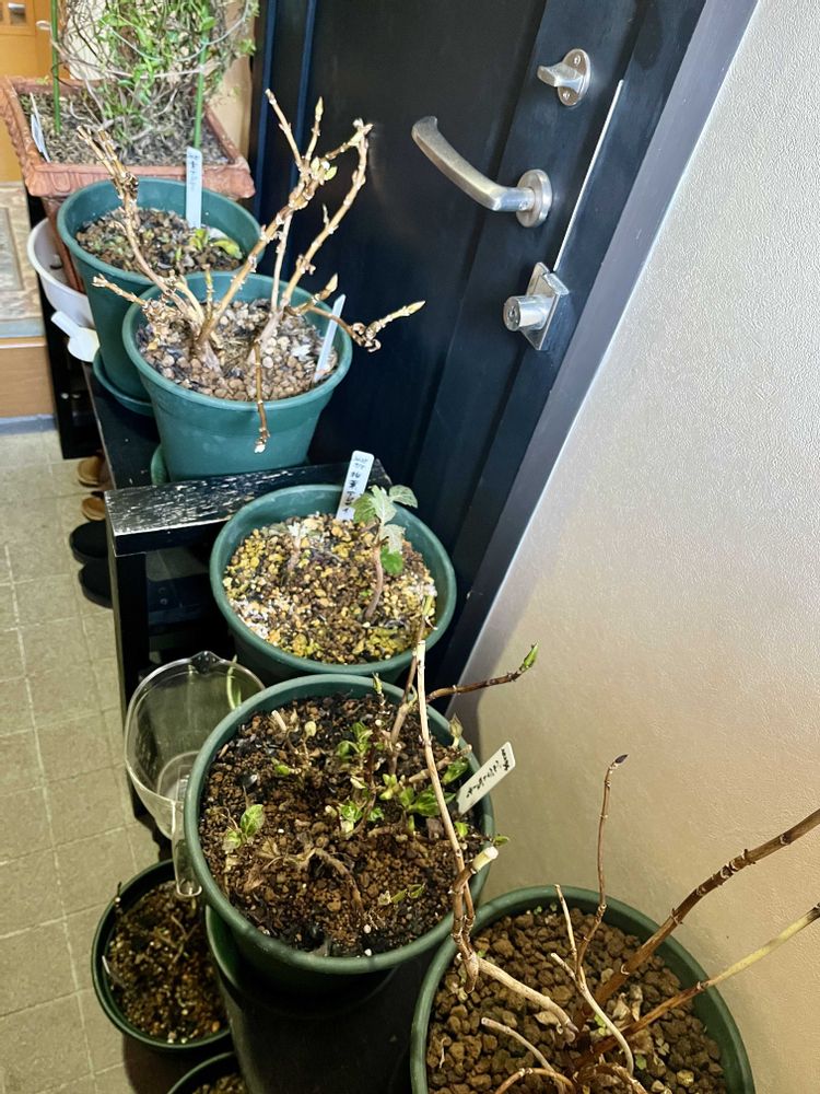 挿し芽をしたクレマチス、バラ、アジサイの鉢を玄関の中に集合