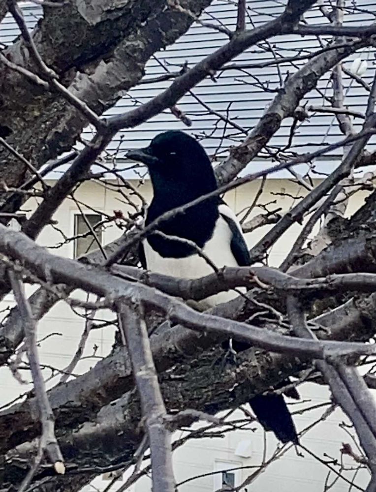 黒と白模様のカササギ、 冬の鳥でしょうか?