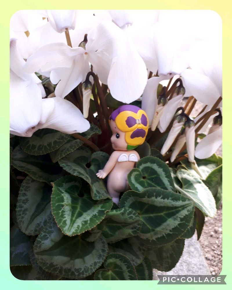 白くて綺麗なシクラメンとかわいい天使👼🪽さんのコラボ、癒されます♪♪♪😊✌️