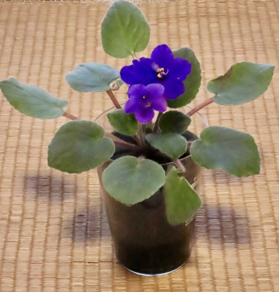 お迎えしたセントポーリアが、ござの上で健気に咲いてます。小さい花が可愛いです。