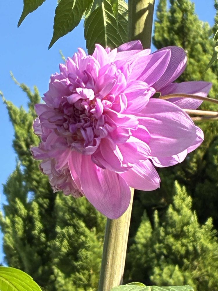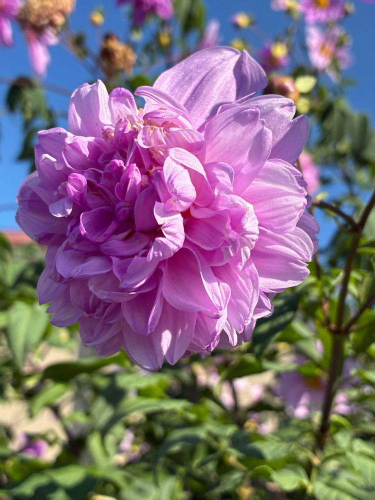 青空の下、ピンク色の八重咲き「皇帝ダリア」が映えます。📸💙🌸🌿😄🤗🌞✌️