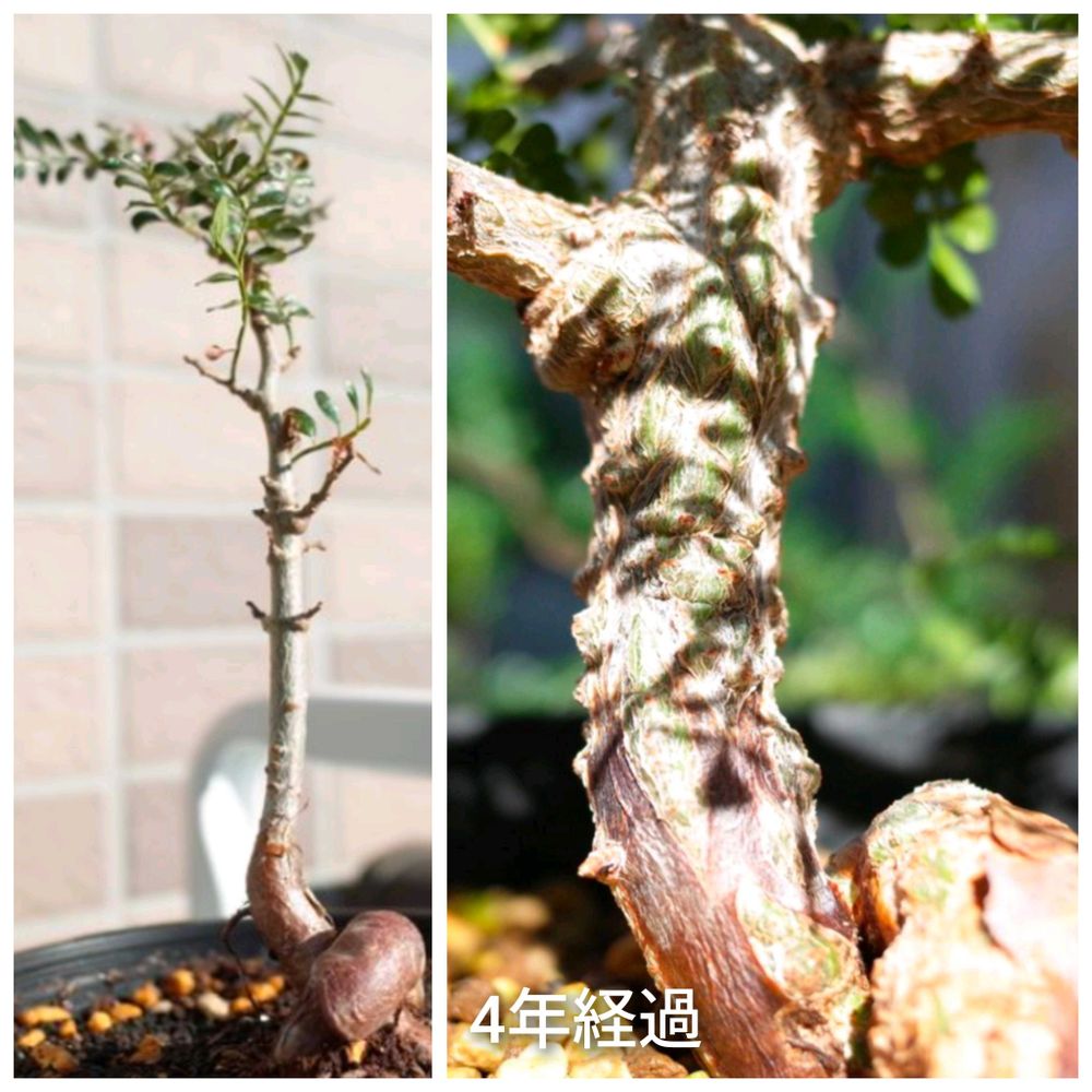 こちらは4年経過して、見違えるようにゴッツゴツに!根の部分も幹の部分も太り方はほぼ同じ、枝が多く展開してる枝の付け根が集中する箇所は幹が格段に太りますね