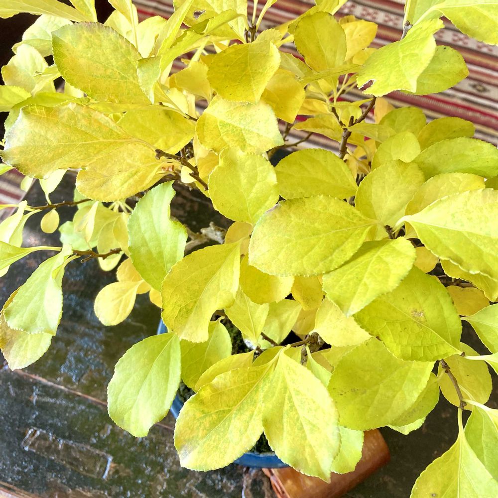 ツルウメモドキ(樹高18cm)が黄色く紅葉しました。左はチリメンカズラです。