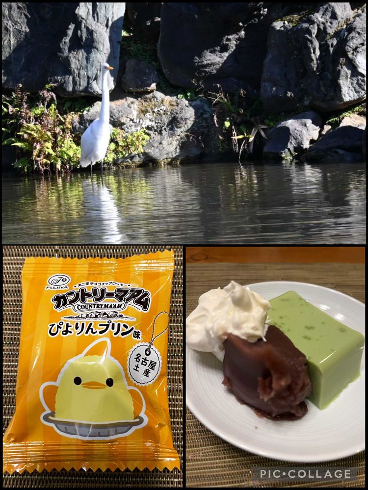 5枚目は小石川後楽園の池にいた白鷺、夫が作った抹茶ババロア、名古屋のお土産にいただいた、カントリーマアムのぴよりんプリン味です。