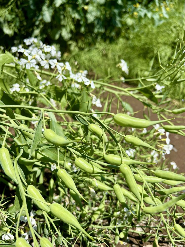 ②カイワレダイコン。実が重すぎて倒れています。このさやの中に例の見慣れた種が詰まっているのでしょう('o')!!!