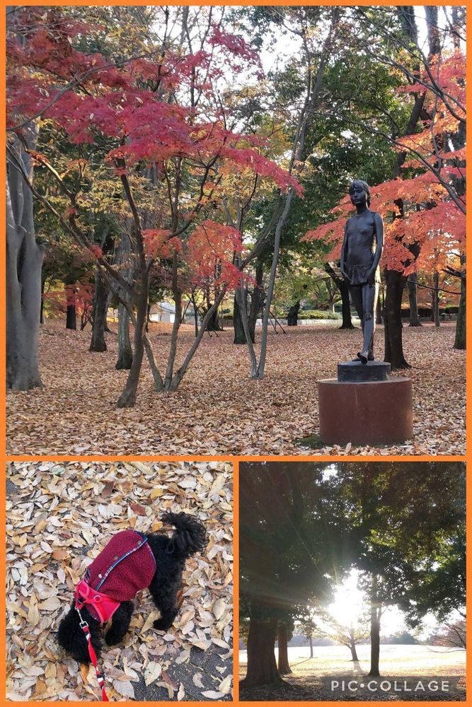 3枚目は、昨日のお散歩の公園の様子。けやきの落葉で、一面絨毯のようです。イロハモミジがさらに紅葉していました。朝日がまぶしい‼️