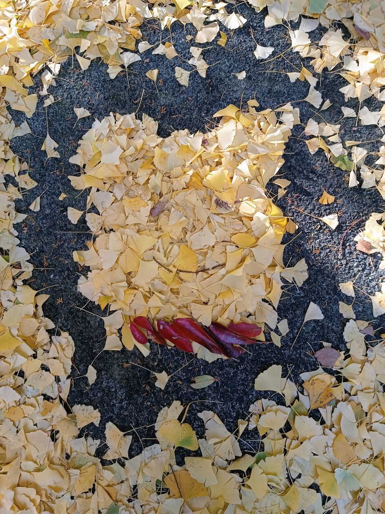 ここの公園は人が多いので、人の少ないお寺の境内のイチョウの落ち葉🍂でプーさん作りました。