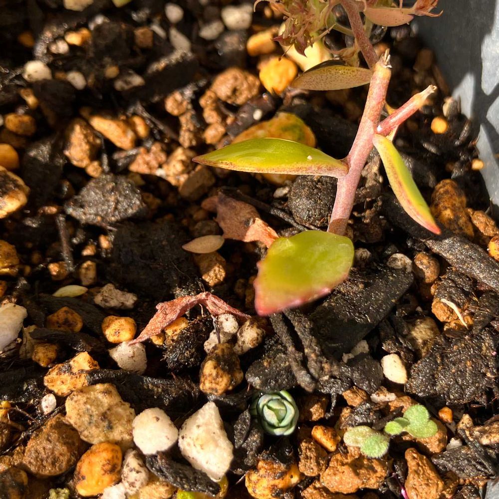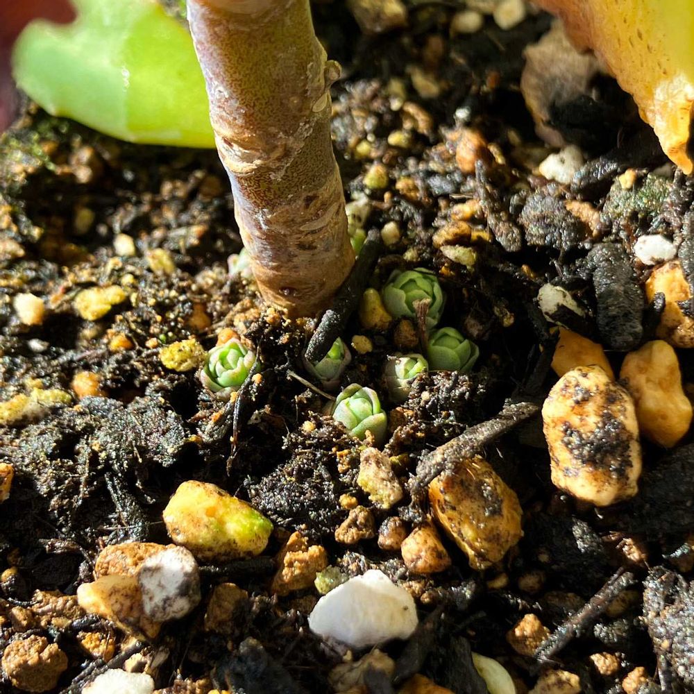 あら‼️まぁ〜‼️可愛い赤ちゃんの芽が🌱良いですね〜 私も多肉さん こぼれ落ちた 部分挿し木にしていますが中々反応がなく 待ちぼうけかなぁ〜🥲
