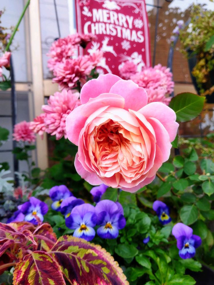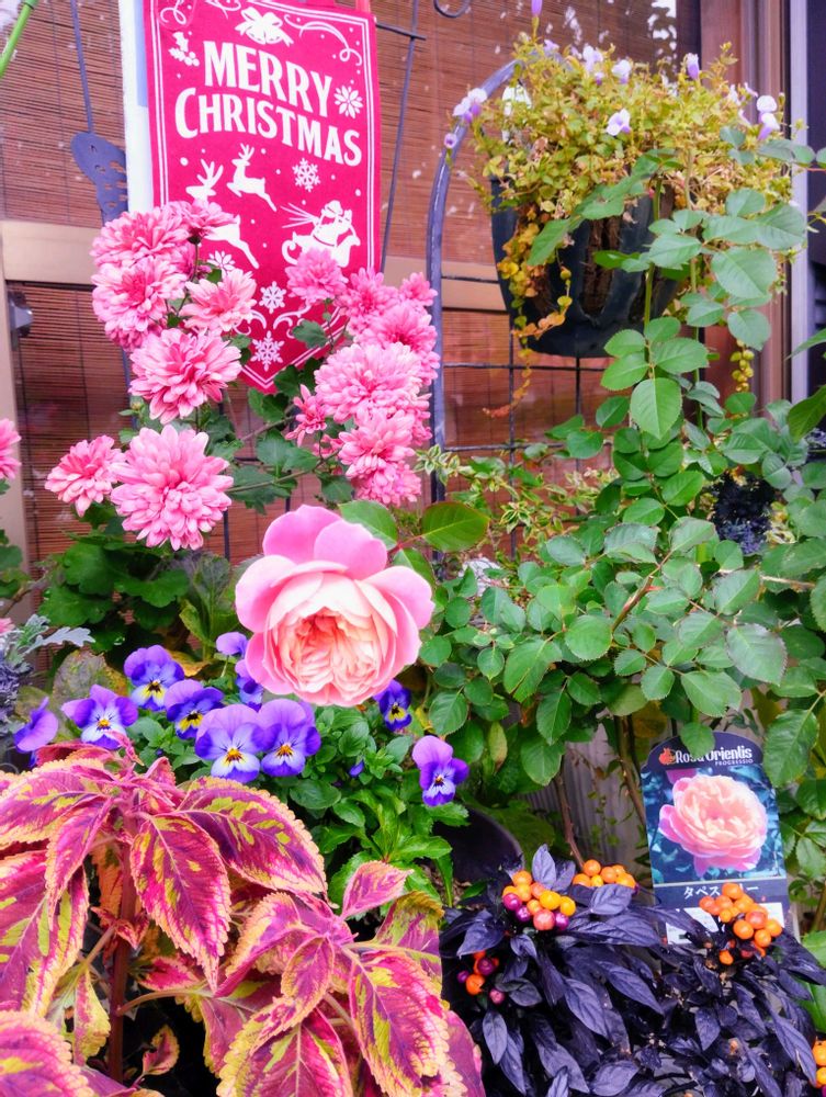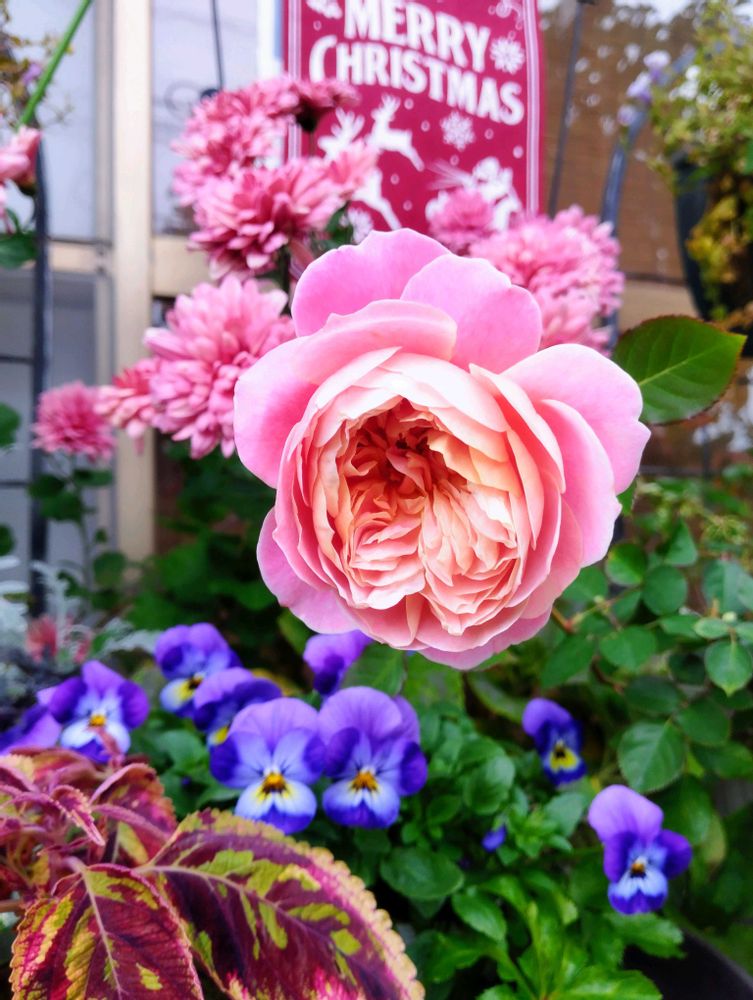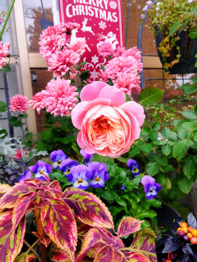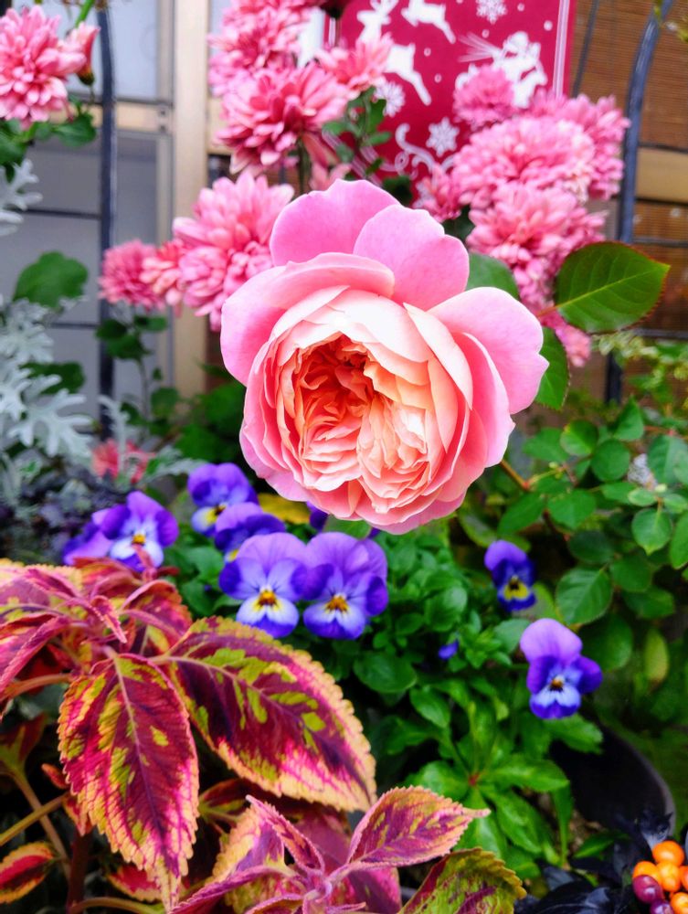 薔薇タペストリーとスプレーマム、ビオラ、栄養系コリウスの共演です🌿