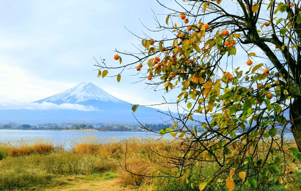 秋の河口湖で美味しそうな柿の実がなっていました。