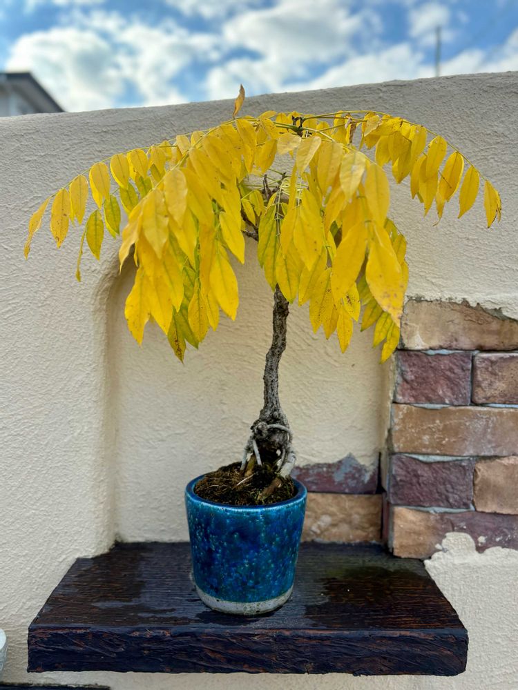 藤の黄葉と鉢のブルーが目に眩しい~💙💛✨