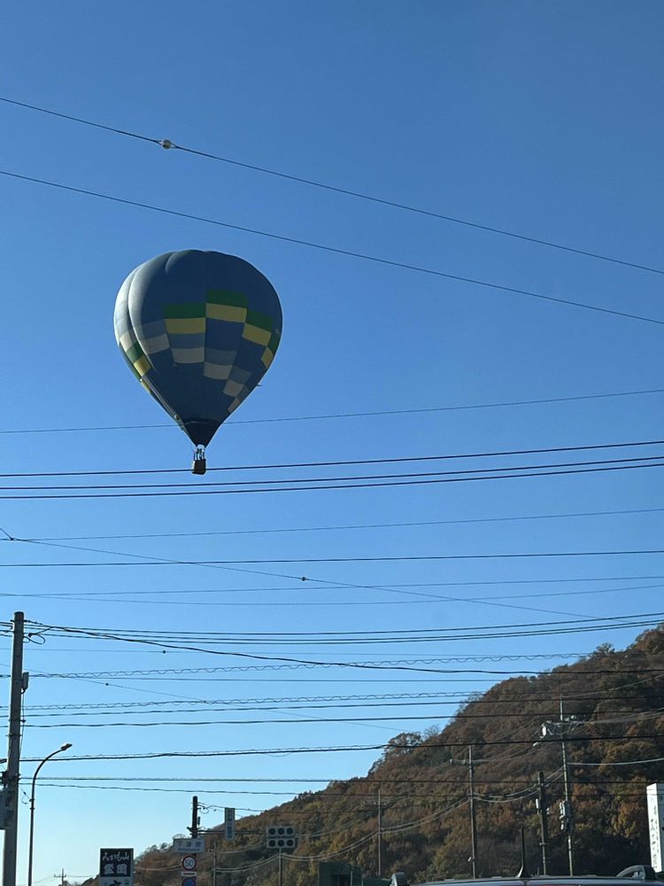週末、田舎の空に浮かぶ気球を見ました。山の紅葉は🍁🗻、ほぼ終わり…かな。3枚目、着地をする瞬間の画像です😊 畑に、みごとに着地していました😊