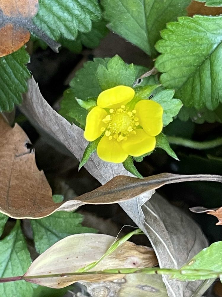 ヘビイチゴのお花がポツポツ咲いているのを見つけました。