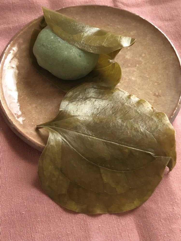 イバラの葉っぱ🌿で柏餅作ってました。田植えが終わった後に。