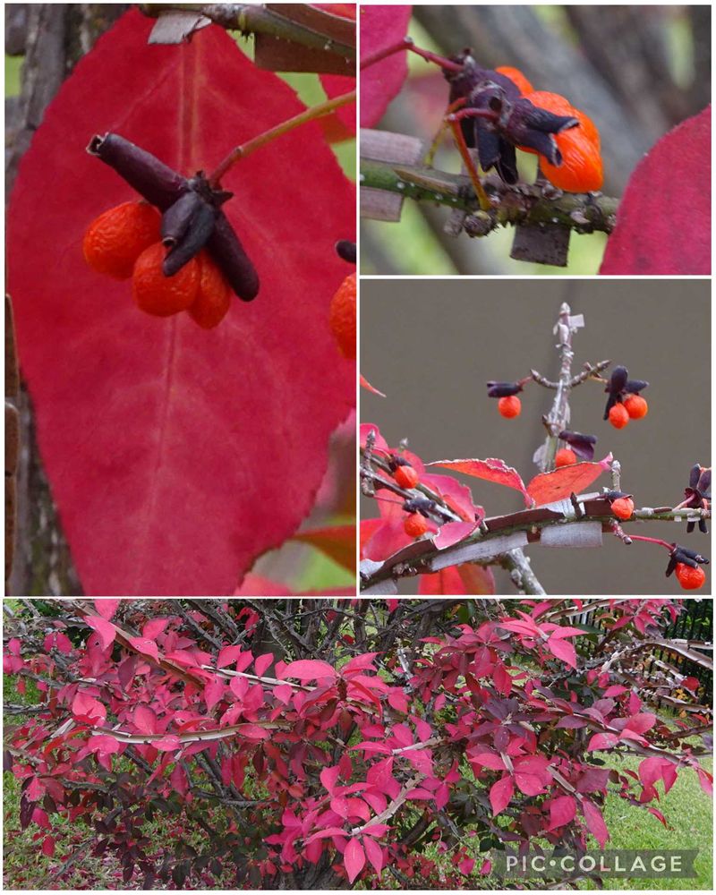 果実はさく果。1〜2個の分果に分かれる。分果は長さ5〜8mmの楕円形。10〜11月に熟す。熟すと裂開し、橙赤色の仮種皮に包まれた種子が顔をだす@松江の花図鑑より