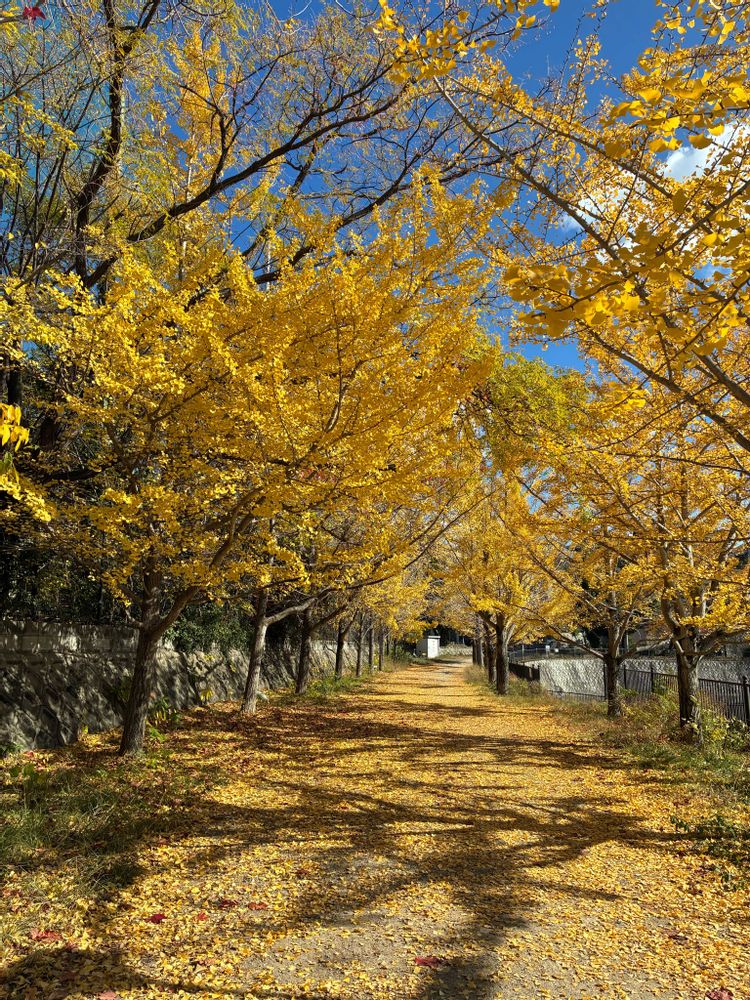 ①イチョウの並木道は、少し葉が散りかけでしたが、黄色の絨毯の上を踏みしめながら歩きました