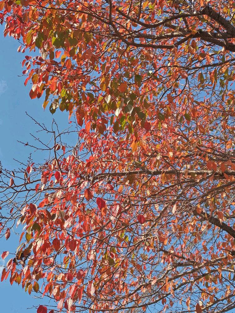 青空に紅葉🍁が映え綺麗やね🎵足元の落ち葉🍂は、色んな