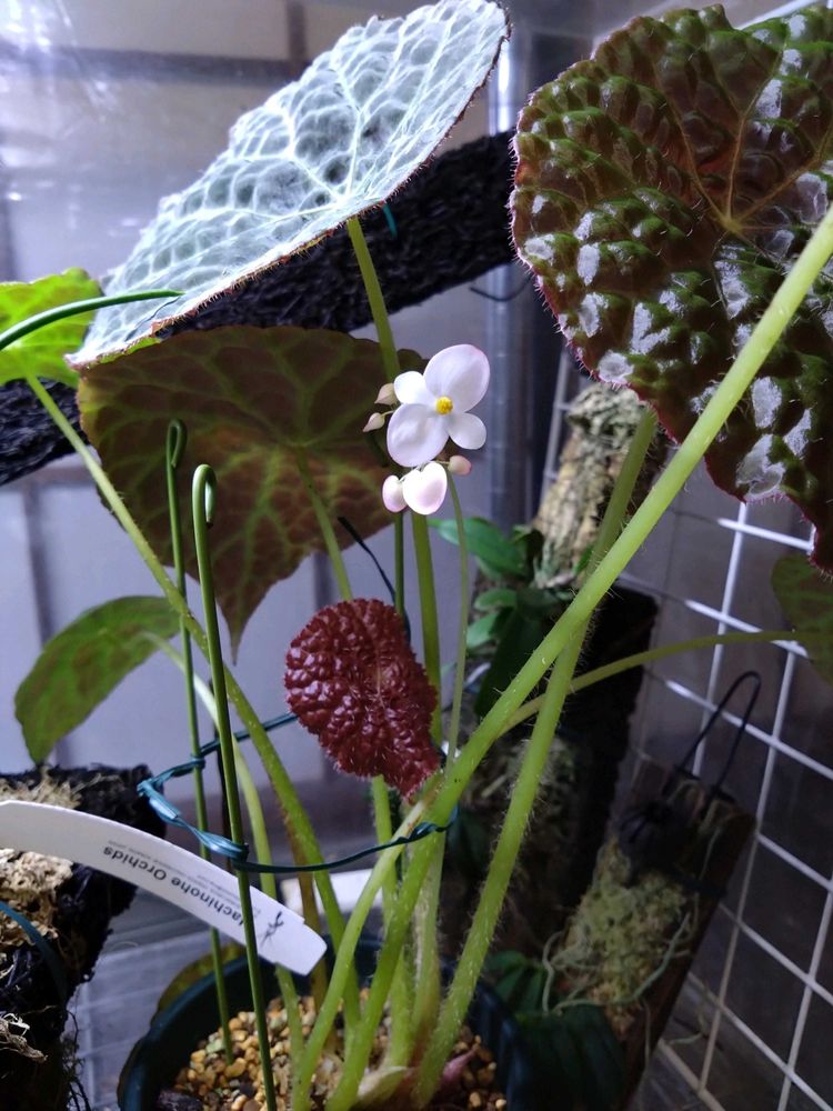 蕾だったベゴニア ゴエゴエンシスがビニール温室内の水槽で咲いてました💚🤍