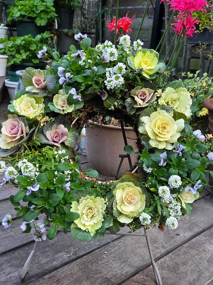 北島園芸のビオラ・藍月と葉牡丹で、ハンギングリースを作りました。