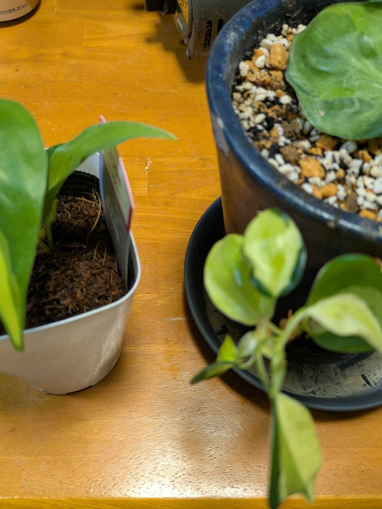 下の方のつややかなグリーンに黄色の模様が入った葉はポトスじゃないよ