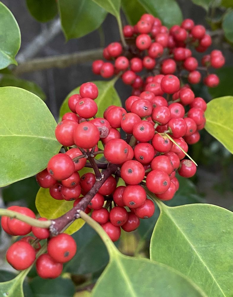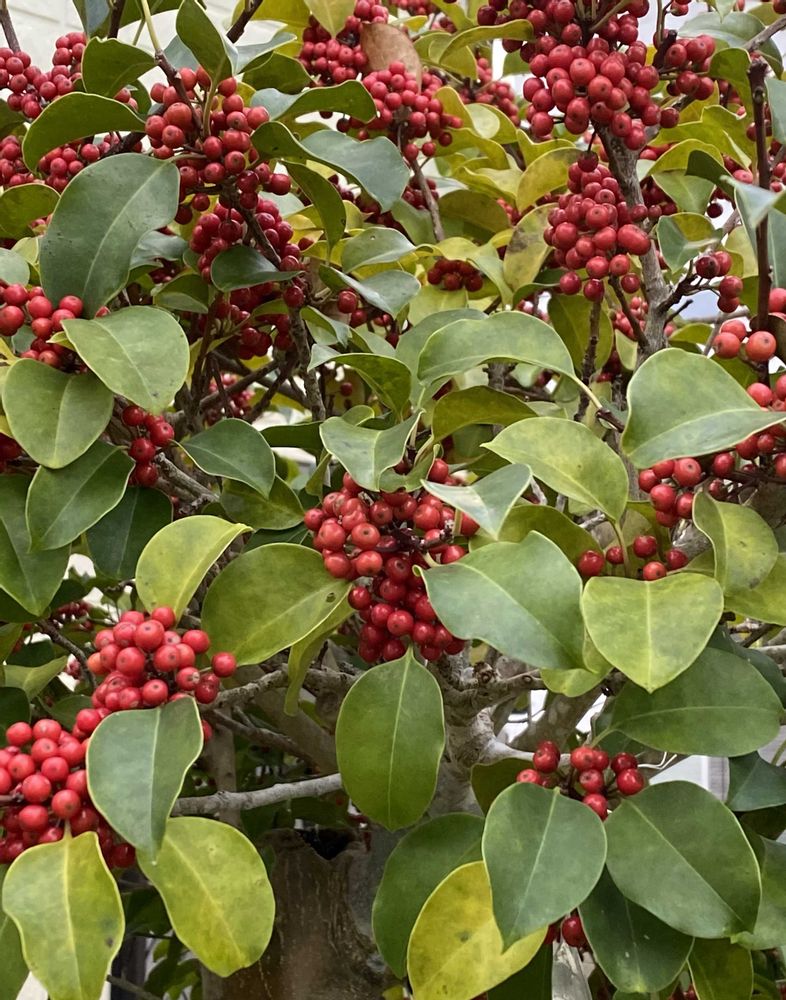 もう少し色づくと、ヒヨドリがやってきて、ギーギーギャーギャーとうるさく鳴いて、実を啄みます😅