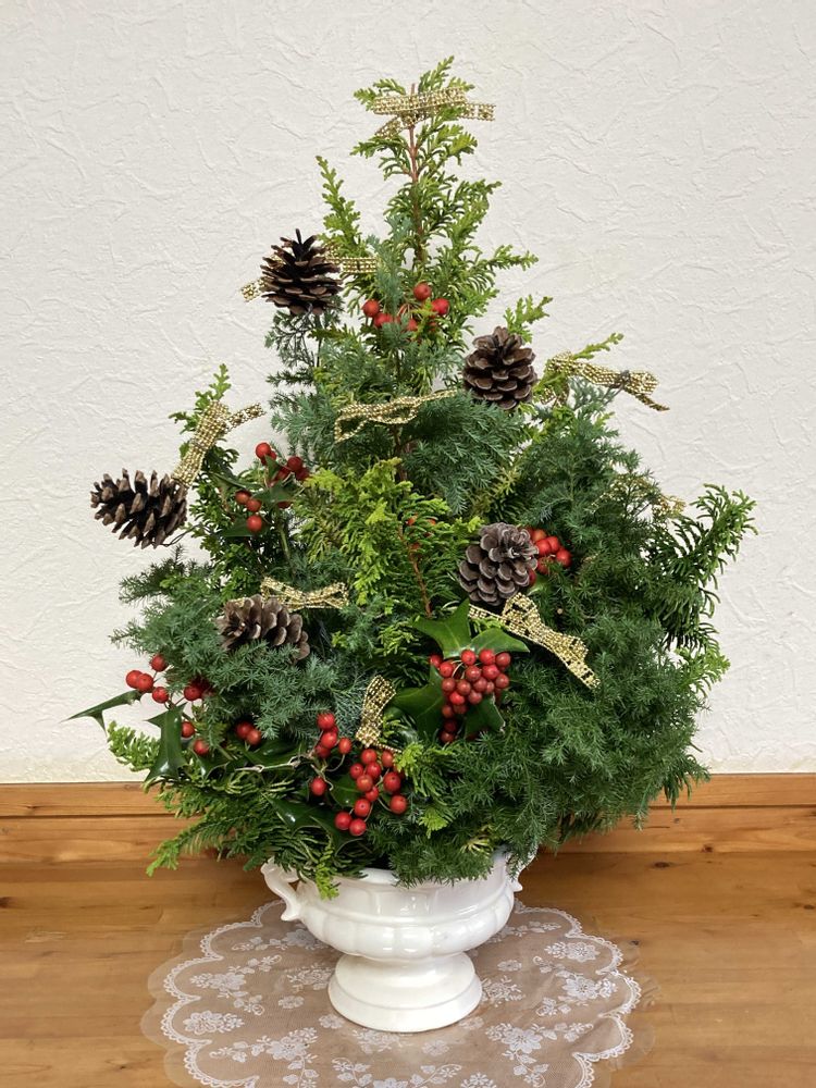 クリスマスホリーの枝を花友さんより分けていただいたのでアレンジしたツリーに使いました
