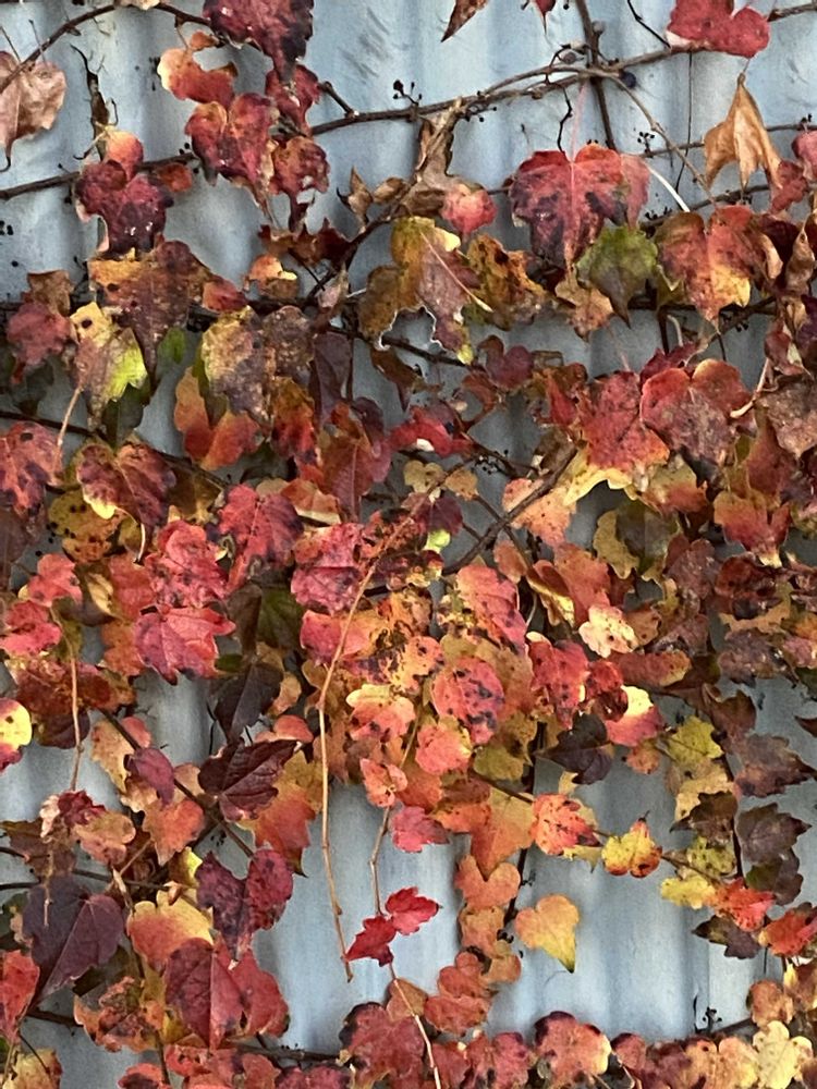 川沿いを歩くと物置?の壁に這った蔦が赤く綺麗です 足元にも這っていました🍁🍂