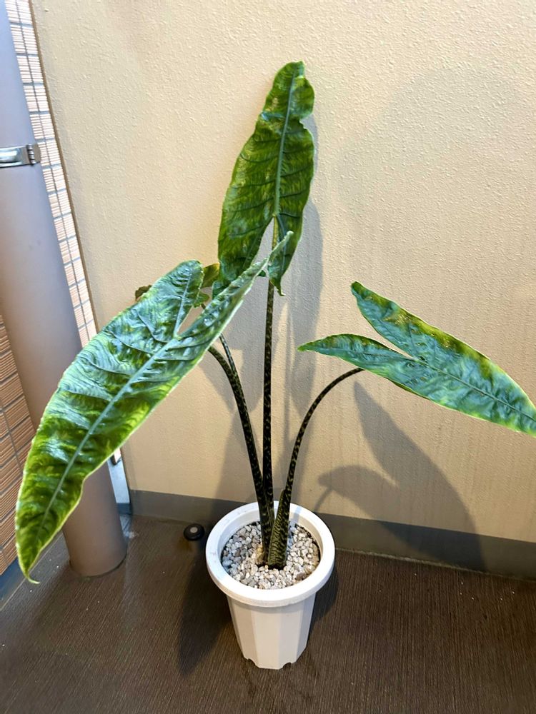 アロカシアの仲間は「クワズイモ」とも呼ばれ、植物の樹液には毒性があるため、植え替えや剪定の際には注意が必要です。