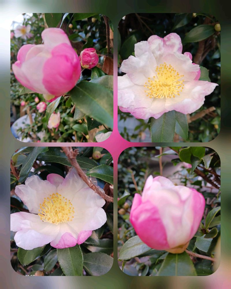白色とピンク色のツートンカラーのサザンカのお花が綺麗に咲いていますね😍