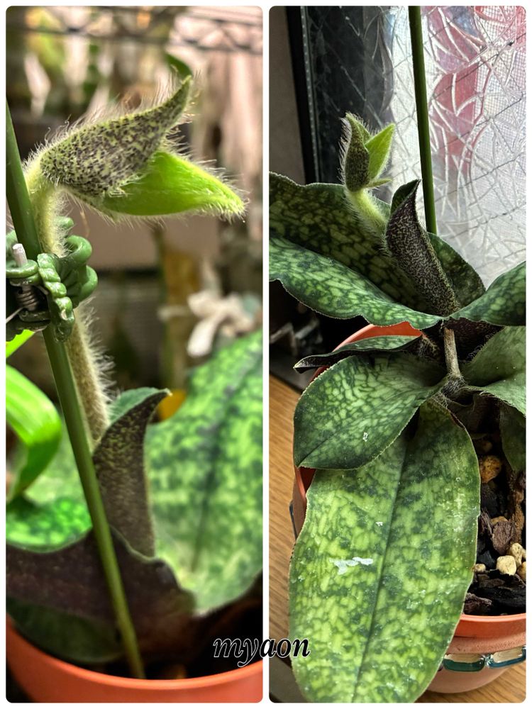 4枚目:パフィオペディルム マリポエンセ Paphiopedilum malipoense 右▶︎11/25 左◀︎12/2の状態。開花するまで時間がかかるそうな~ꉂ🤭1週間毎の変化を観察しようかな❤️