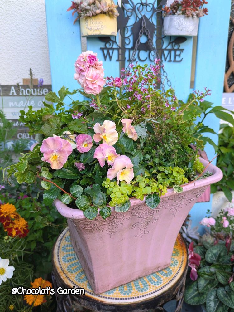 可愛い明るいピンクのお花が欲しいわね💕と母が言うのでパスフリと八重咲きストック、キンギョソウ(秋の寄植えからの使い回しで今は咲いてないけど)、クフェア、ティアレラで寄植えしました。