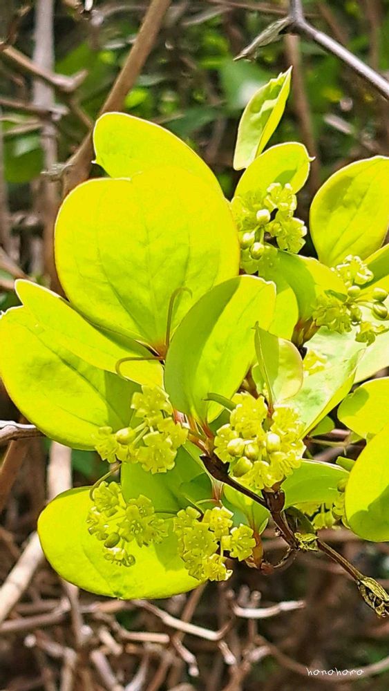 ❶雄花 小花が集まって半球、基本雄蕊は6本、花びらは光沢があります。