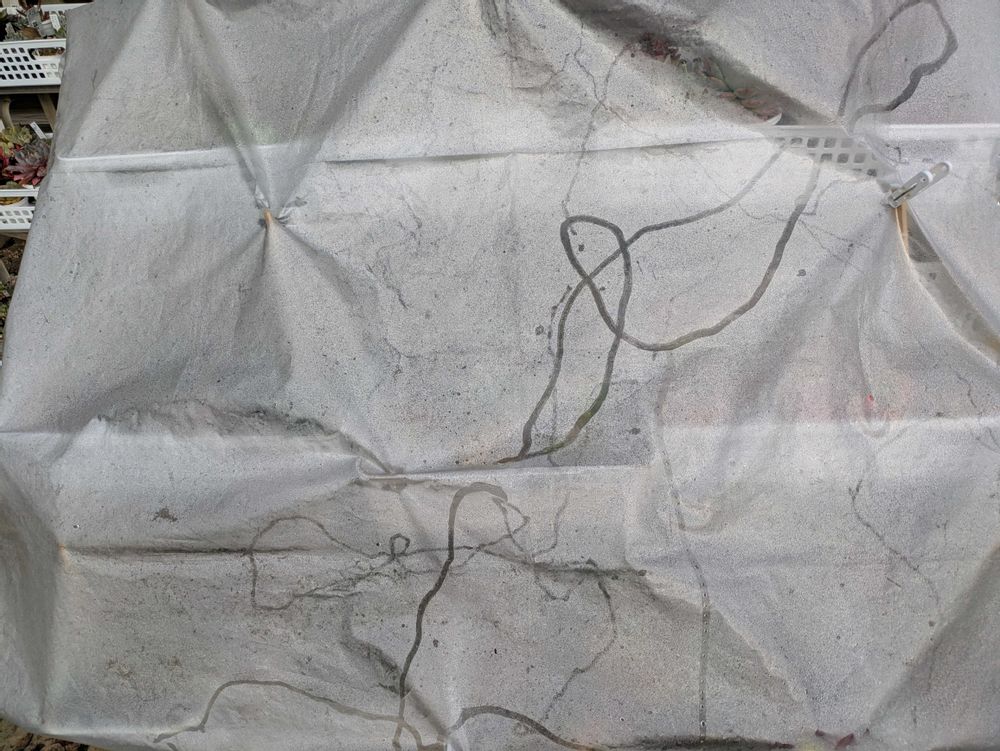 3p 朝 雨避けのビニールシート 何かが …… 見てもわからなかったですが 1cm位のカタツムリがよくいて薬食べています😔
