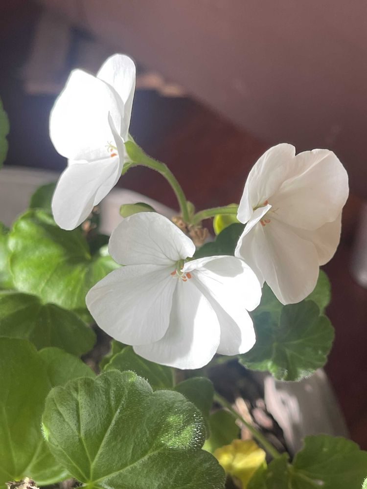 ② 冬越し中の、白のゼラニウムが、咲きました。