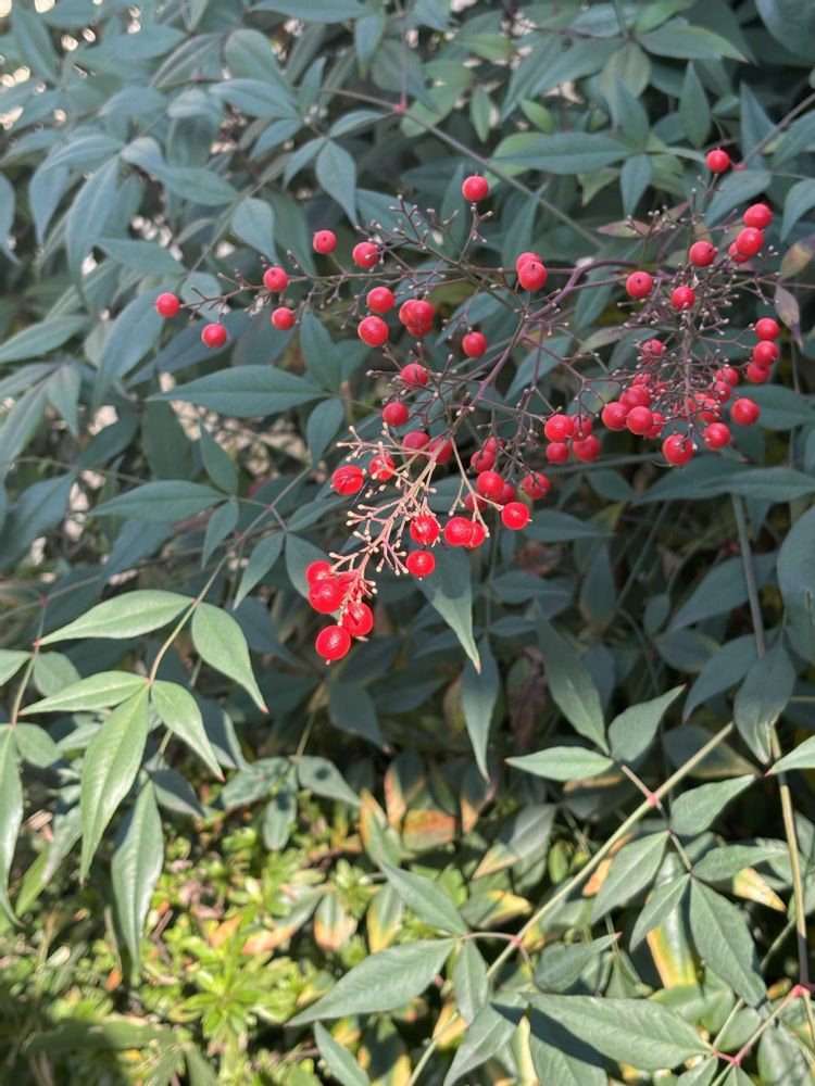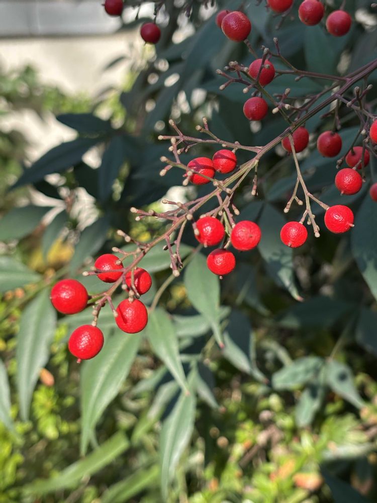 山猿娘🐒が住むマンションの駐車場で南天(ナンテン)の実がピカピカに光っていました。