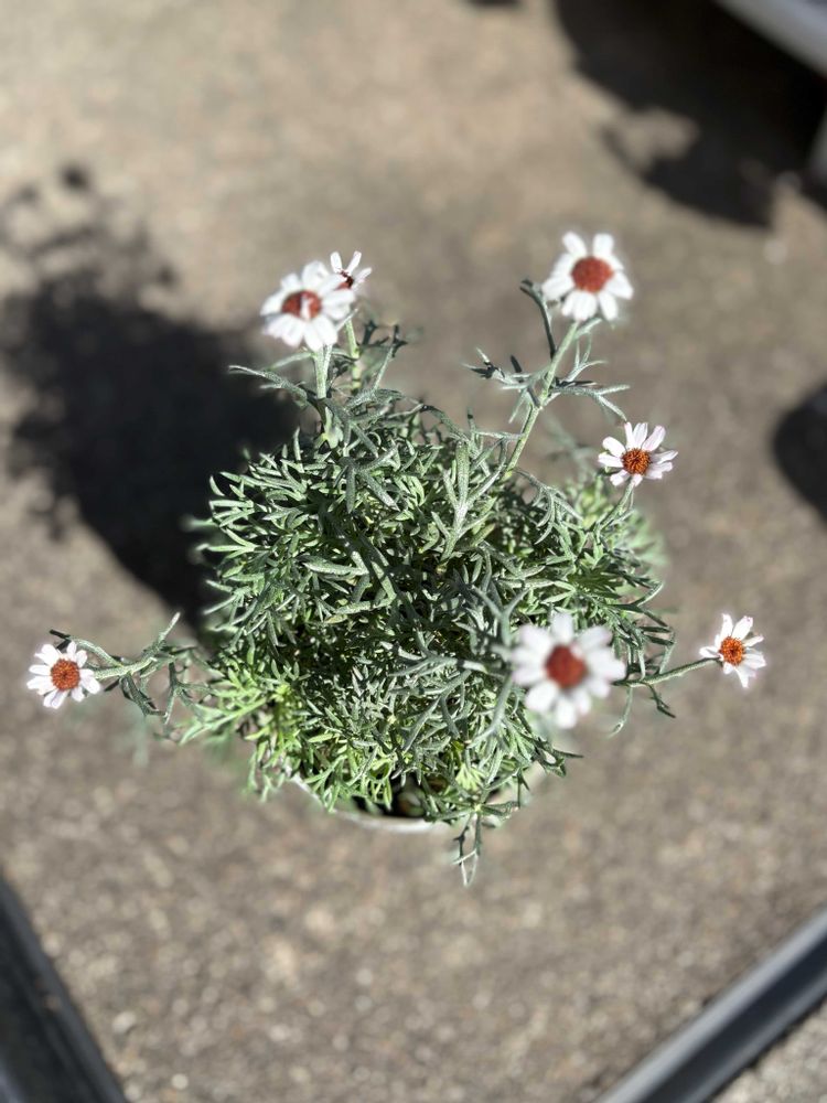 寄せ植えの様子。ローダンセマムとカレックスの絡み具合がステキです。