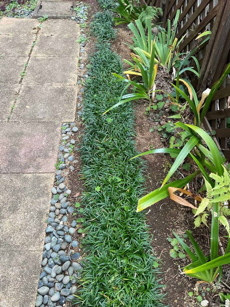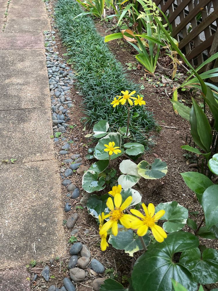 2枚目、3枚目は 庭の端っこ、日当たりは 少ない所ですが、リュウノヒゲ🌱が 帯状に広がって行き、ツワブキも 黄色🟡の花を 咲かせて