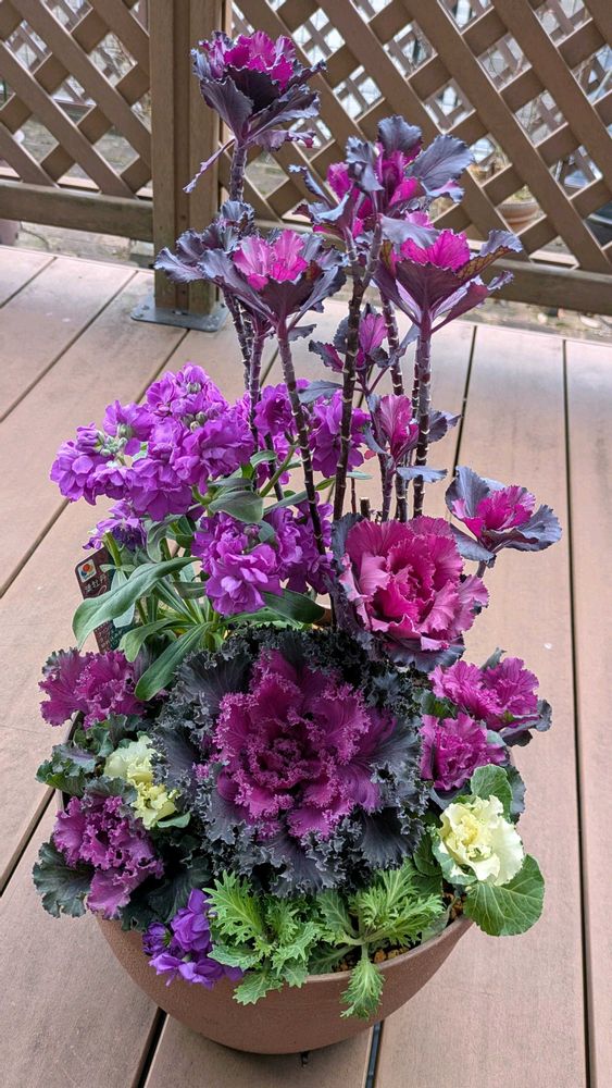 わぁ〜😲素敵〜💜葉牡丹が、お花にみえます🌸同系色で揃えて寄せ植えするとこんなになるんですね~。紫色のストックがアクセントになってとっても素敵です。真似したくなります😊