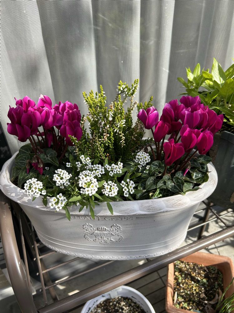 ③お手頃価格のガーデンシクラメン、カルーナ、白いアリッサムで。