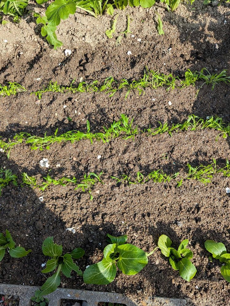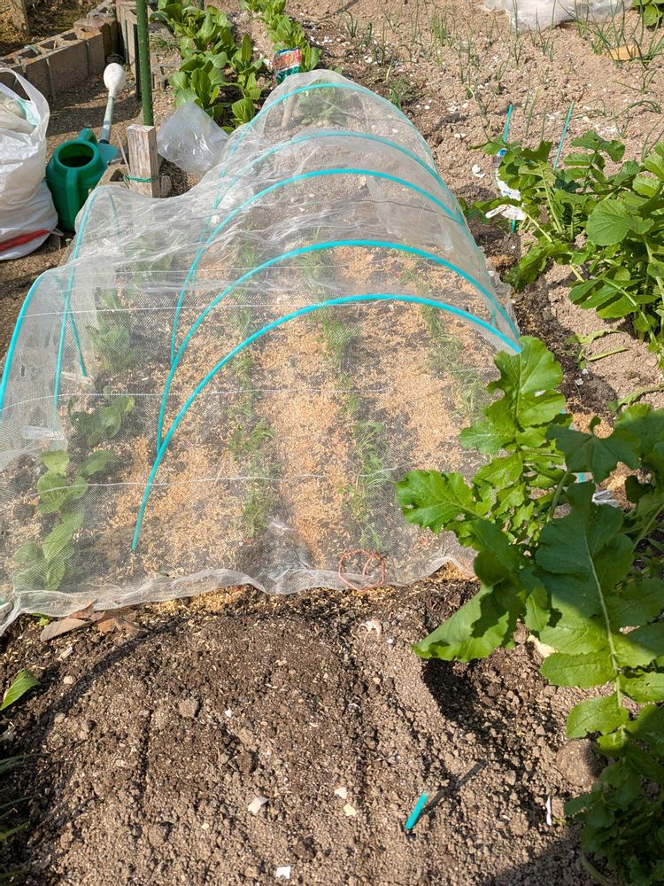 ④⑤サラダ水菜🌱の植え継ぎ、不織布〜ナイロン掛けて午前中終わりました。