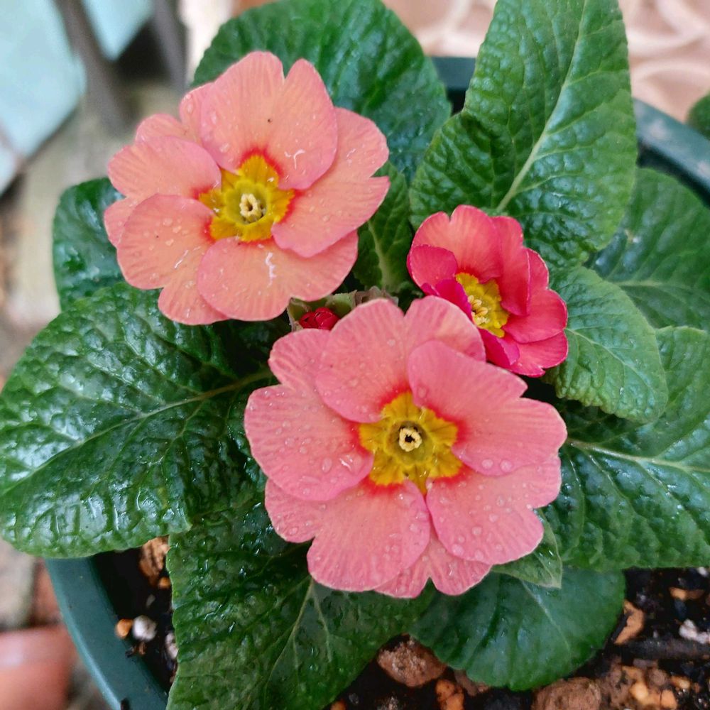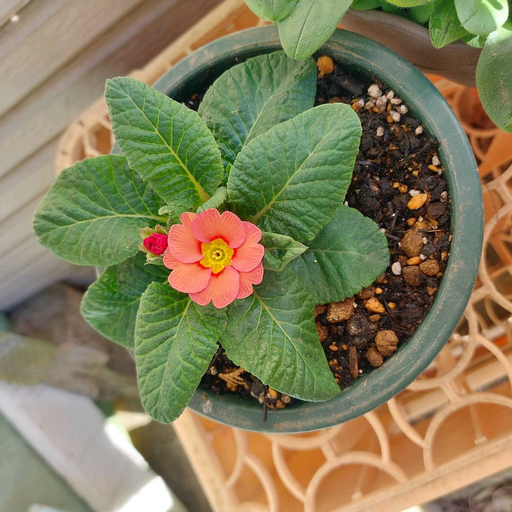 赤い蕾が、見えて来たので🌼 赤いプリムラと、思ったらピンクのようなオレンジのような、初めての色・・₍₍( ´ᵕ` *)⁾⁾楽しみ♡