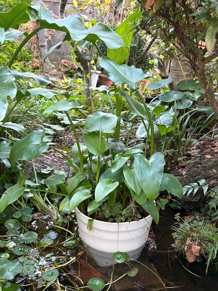 先月に鉢を植え替え(入れ替え?)た池のカラー(白い鉢)