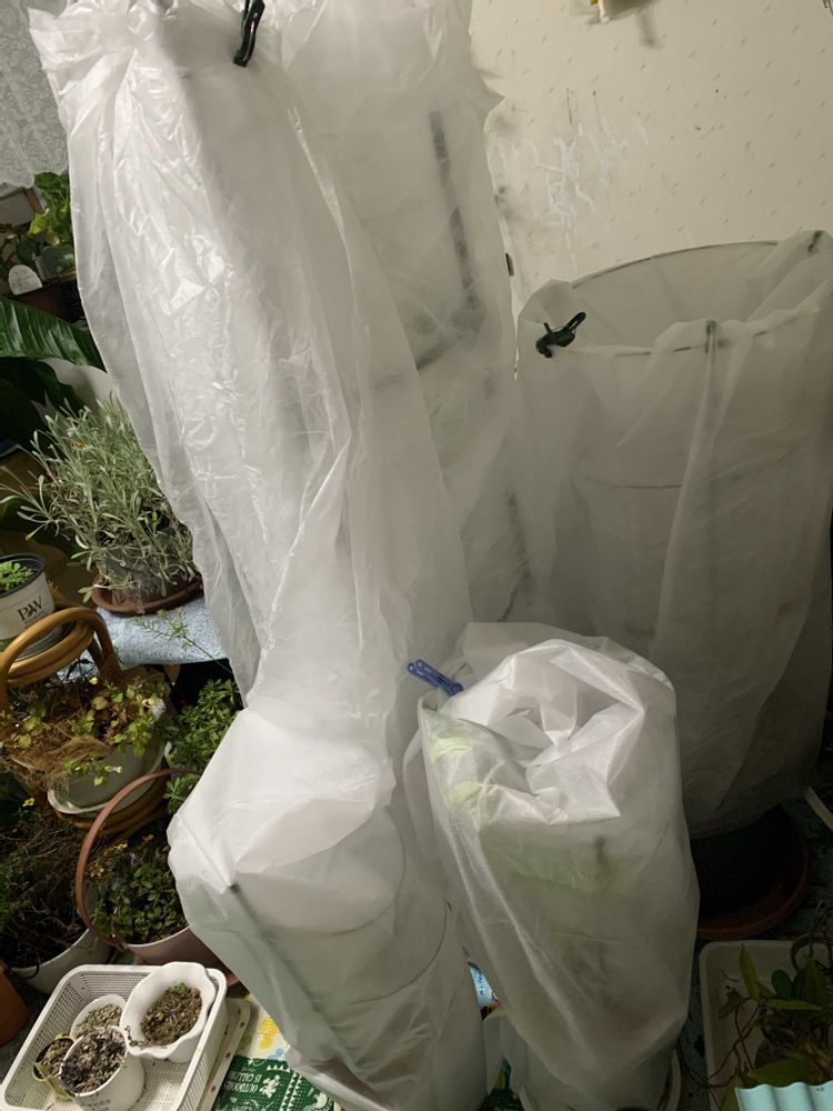クライミングサンパラソル、不織布で覆って冬眠でーす