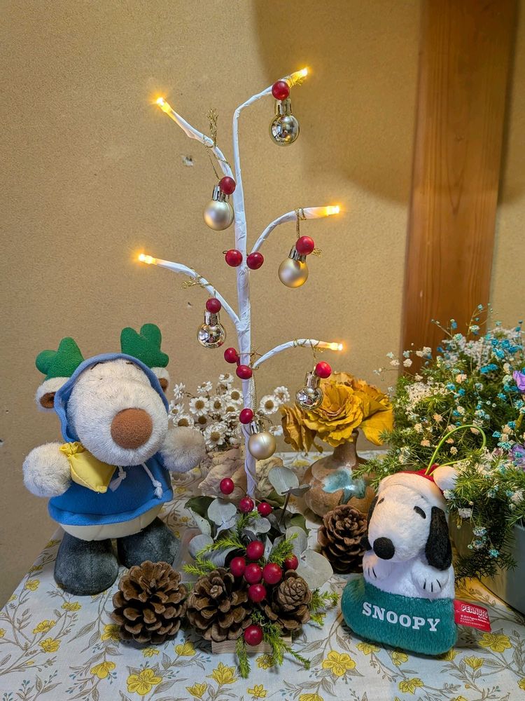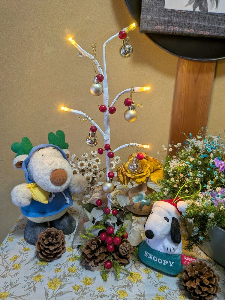 ¥100shopで見つけた乾電池(単3、2本)で灯るBranch treeにゴールドテイストのアンティークボール(20mm)にサルトリイバラの🔴を刺してデコレート🤭