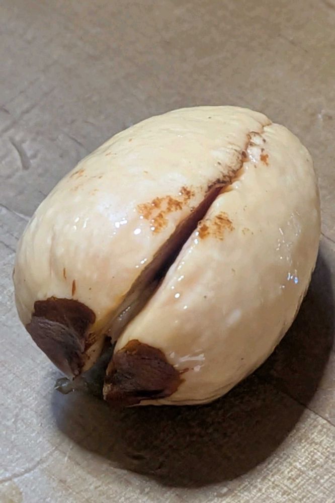 調べたら種の底側を数ミリ切るのが良いとネット情報に書いてたけど、切った所から腐りそうだし1粒だけカット=͟͞🔪