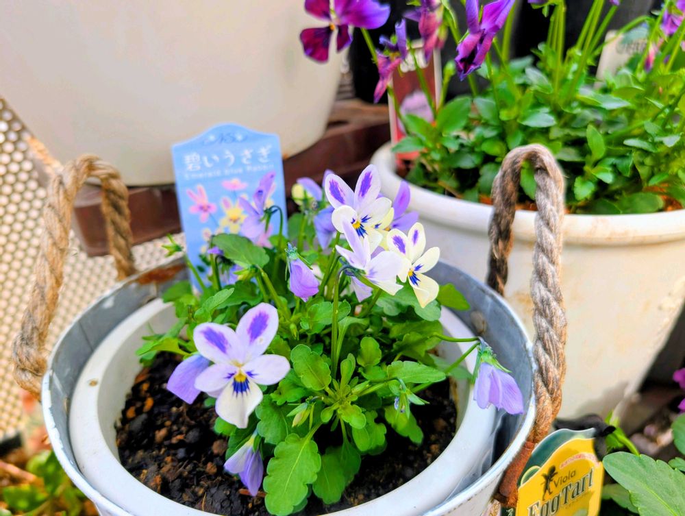 うさぎの耳のような形をした小輪ビオラで、咲き始めは白く、咲き進むにつれて青色(藤色)に変化するのが特徴です。