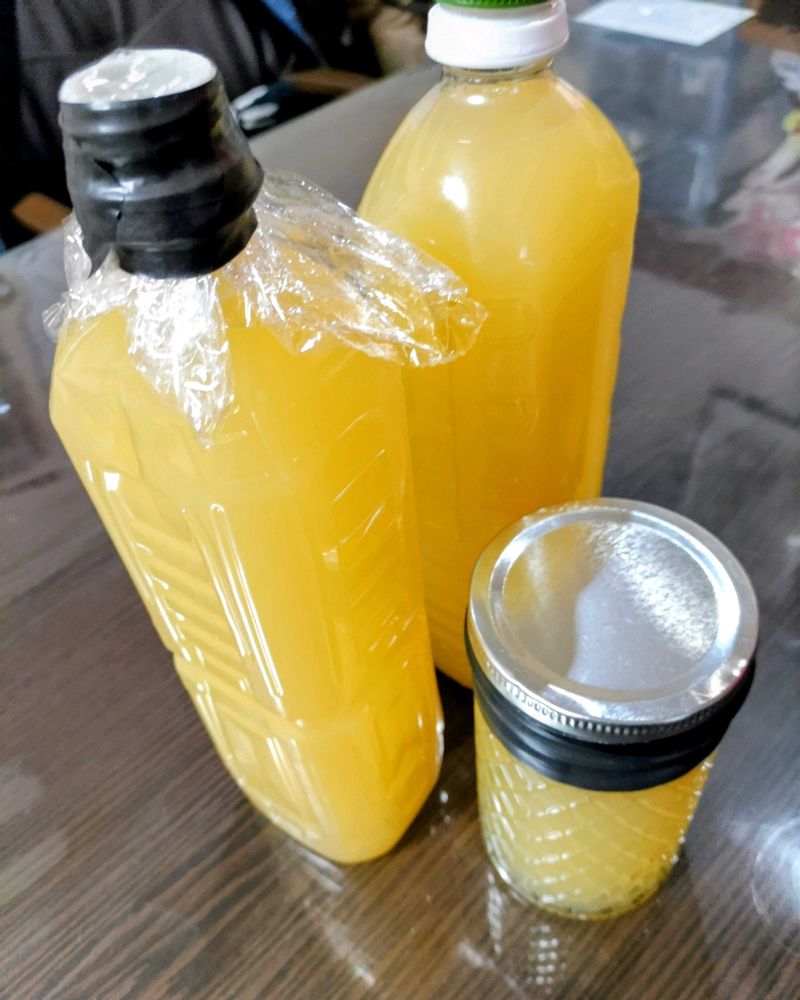 数年前は、さらしの袋に入れ手作業して絞りましたが、仲間のレモン絞り道具を借りて絞ったら便利で、アッという間に、750㍉のペットボトル2本とガラス瓶に入れる量出来ました✌️🙆🎶💓。